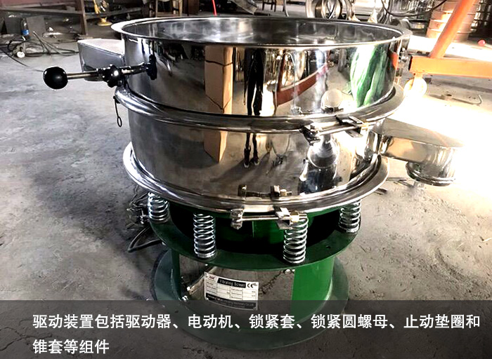 驅(qū)動裝置包括驅(qū)動器、電動機、鎖緊套、鎖緊圓螺母、止動墊圈和錐套等組件,其中,錐套固定在篩框上,驅(qū)動器的驅(qū)動軸設置在錐套內(nèi)并通過鎖緊套來連接固定其位置。本實用新型精細篩分機與現(xiàn)有篩分機相比具有結(jié)構(gòu)先進實用、性能穩(wěn)定可靠、安裝調(diào)試方便、制造費用低等優(yōu)點。